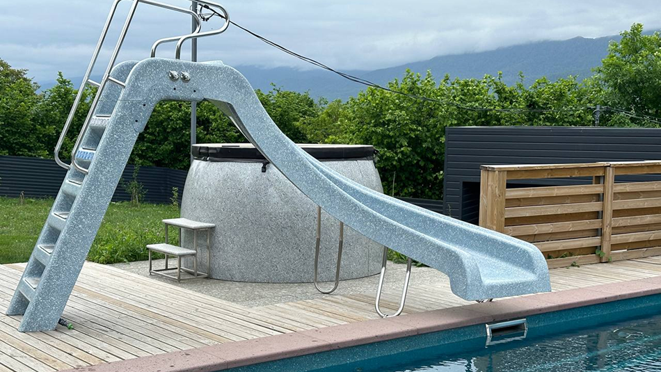 - Все элементы подачи воды, а также обратная сторона горки закрыты декоративной накладкой из стеклопластика. Подобное решение не имеет аналогов и придает эстетическую завершенность. Для оборотной стороны горки возможно выбрать любое покрытие из 17 цветов коллекции FRANMER.